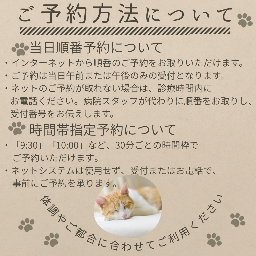 インターネットによる当日順番予約の受付時間は、 ・午前診察受付 8時30分~12時 ・午後診察受付 15時30分~18時30分になります😸 ご不明な点がございましたら、お気軽にお問い合わせ下さい🐶